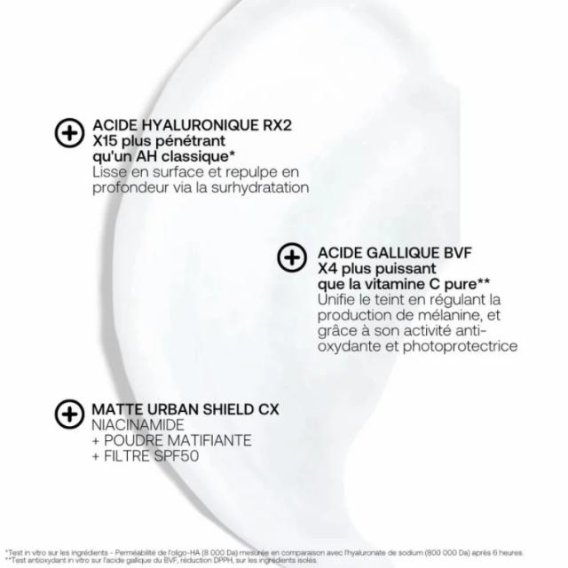 THE MATTIFYING FLUID, A REAL DAILY SHIELD All skin types – All ages – Paraben-free – Vegan formula – 76% natural ingredients An ultra-light mattifying fluid, formulated to be imperceptible on the skin, protecting from pollution and providing the strongest UV protection for an urban shield action throughout the day. Perfectly mattified and hydrated, the skin reveals its natural radiance. Moisturizer thanks to the Rexaline hyaluronic acid duo, 15 times more penetrating than classic hyaluronic acid Standardizing thanks to 3Bright active enriched with gallic acid BVF 4 times more antioxidant than pure vitamin C Protective thanks to the Matte Urban Shield complex combining the trio of anti-pollution polysaccharides, mattifying powder and anti-UVA-UVB filters You will appreciate this texture light and non-greasy with a matte finish , delicately scented and respectful of the PH of your skin. The skin is mattified for the day upon application . On a daily basis, the skin is protected against external attacks . * Self-assessment test - 28 days - 20 volunteers - % agreement