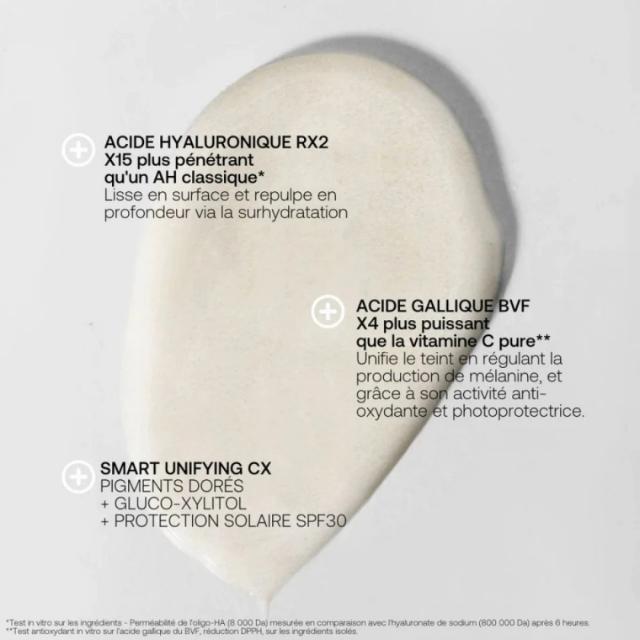 THE BASIS OF A FLAWLESS COMPLEXION All skin types – All ages – Paraben-free – Vegan formula – 89% natural ingredients A unifying basis including intelligent pigments that adapt to skin tone to blur skin imperfections and even out the complexion. The complexion is visibly clearer and luminous, naturally perfect. Moisturizing thanks to the Rexaline hyaluronic acid duo, 15 times more penetrating than classic hyaluronic acid Standardizing thanks to 3Bright active enriched with gallic acid BVF 4 times more antioxidant than pure vitamin C Perfect skin effect thanks to the Smart Unifying Complex combining invisible corrective pigments, smoothing plant sugars and anti UVA-UVB protective filters You will enjoy this fluid texture with bare skin effect , delicately scented and respectful of the PH of your skin. From the first application, imperfections are immediately blurred to reveal a flawless complexion. Day after day, the skin is plumped and luminous.